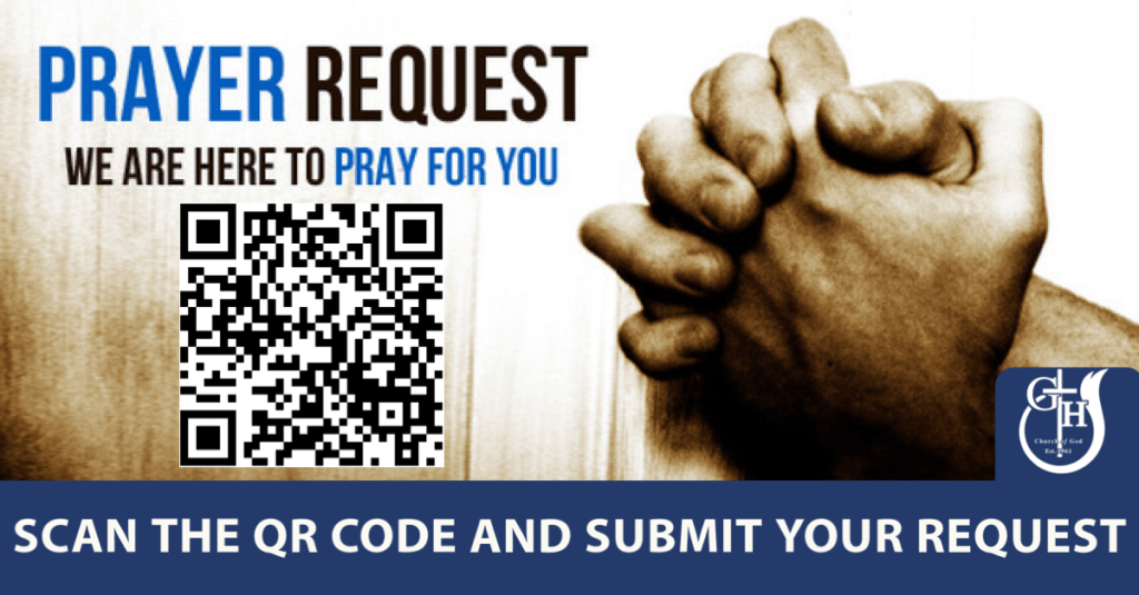 You can also send us your prayer requests so that we can pray with you. The Bible speaks of agreement in prayer. At Grand Haven Church of God, we want Gods best for your life. So, if we can pray with you for a specific request, please let us know. We have an online form you can fill out and send us and our prayer team will go to work praying on your behalf. Scan the QR below to be taken to our online prayer form or you can go to https://grandhavencog.com/contact/prayer/.