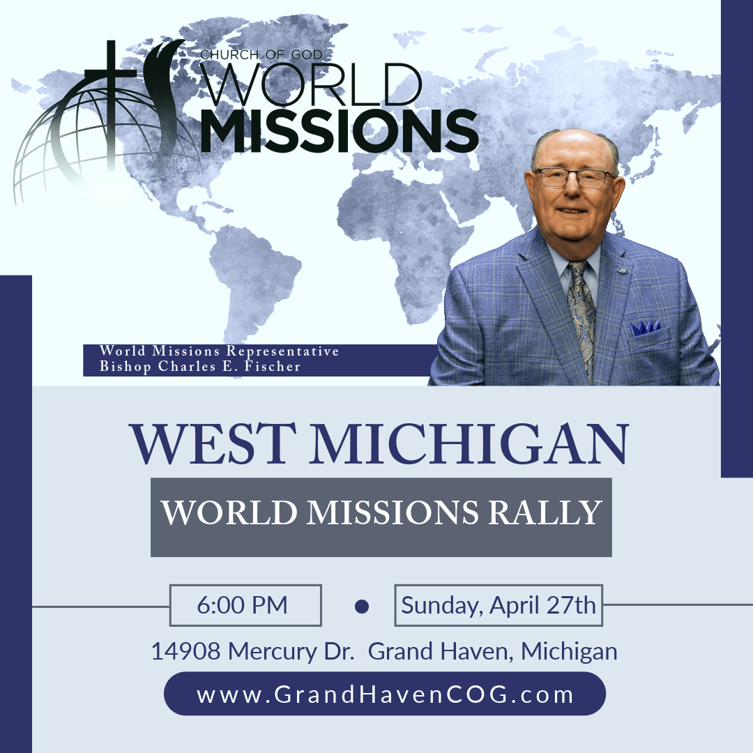 West Michigan World Missions Rally with Church of God world missions representative, Bishop Charles E. Fischer. Sunday April 27 at 6pm