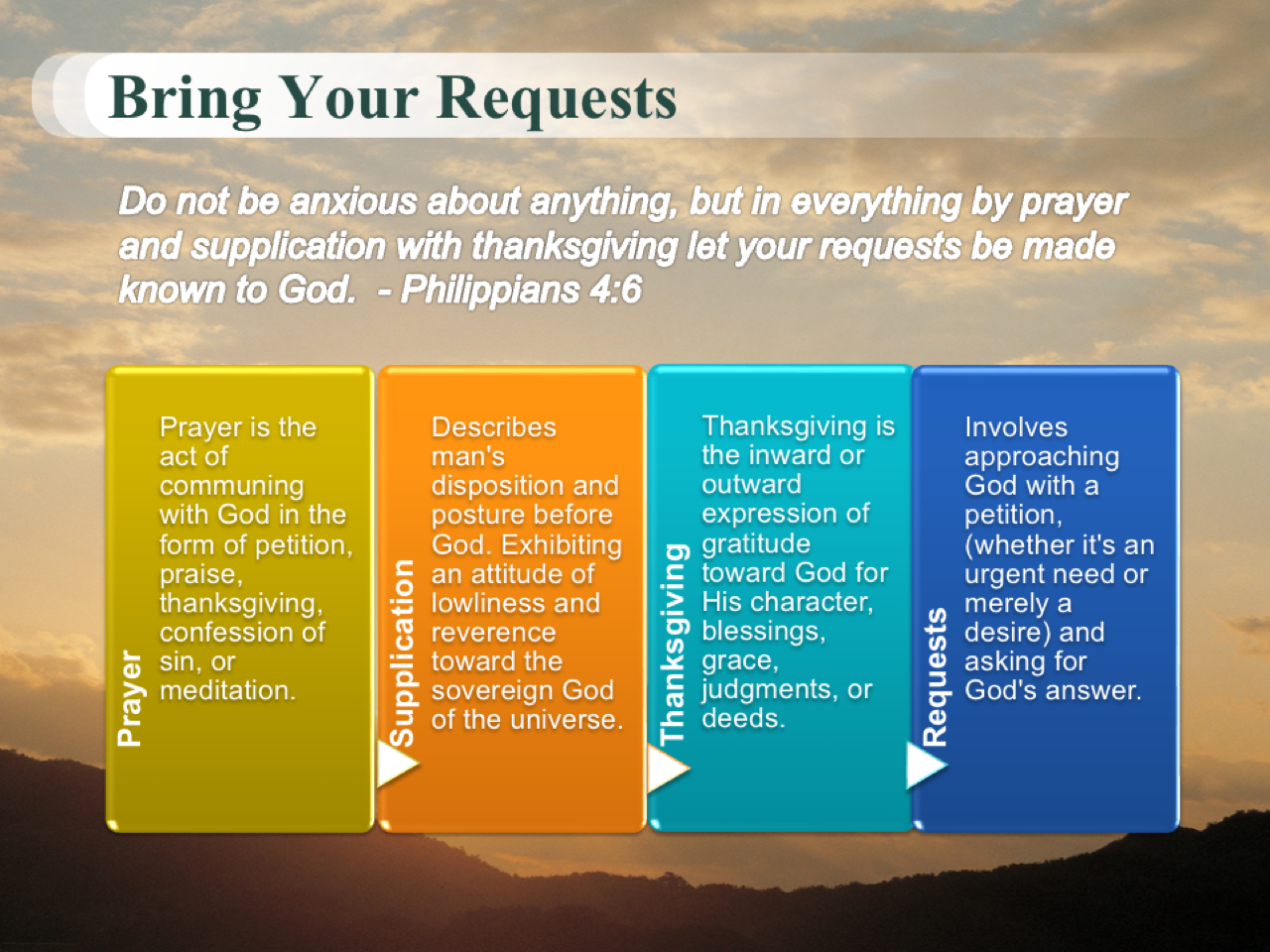 [Phl 4:6 NKJV] Be anxious for nothing, but in everything by prayer and supplication, with thanksgiving, let your requests be made known to God.